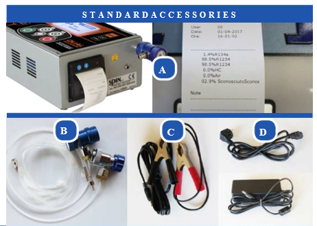 (% HFO och andra gaser närvarande, R134a, R22, HC, luft) och enligt VDA-standarden (renhet ≥95% ok / inte ok)